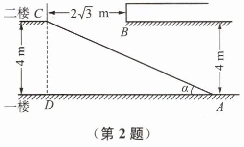2. 某大型超市为方便顾客购物,准备在一楼至二楼之间安装自动扶梯(如图),楼顶与地面平行. 要使身高 $ 2 \mathrm{ m} $ 以下的人在笔直站立的情况下搭乘自动扶梯时,在 $ B $ 处不碰到头部. 请你计算:自动扶梯与一楼地面的夹角 $ \alpha $ 最小为多少度.