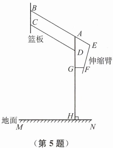 5. 四边形具有不稳定性,工程上可利用这一性质解决问题. 如图是某篮球架的侧面示意图,$ BE $、$ CD $、$ GF $ 为长度固定的支架,支架在点 $ A $、$ D $、$ G $ 处与立柱 $ AH $ 连接($ AH ⊥ MN $,垂足为 $ H $),在点 $ B $、$ C $ 处与篮板连接($ BC $ 所在直线垂直于 $ MN $),$ EF $ 是可以调节长度的伸缩臂(通过旋转点 $ F $ 处的螺栓可以改变 $ EF $ 的长度,使得支架 $ BE $ 绕点 $ A $ 旋转,从而改变四边形 $ ABCD $ 的形状,以调节篮板的高度). 已知 $ AD = BC $,$ DH = 208 \mathrm{ cm} $. 若测得 $ \angle GAE = 60° $ 时,点 $ C $ 距离地面的高度为 $ 288 \mathrm{ cm} $,则调节伸缩臂 $ EF $,将 $ \angle GAE $ 由 $ 60° $ 调节为 $ 54° $ 时,点 $ C $ 距离地面的高度升高了多少?
