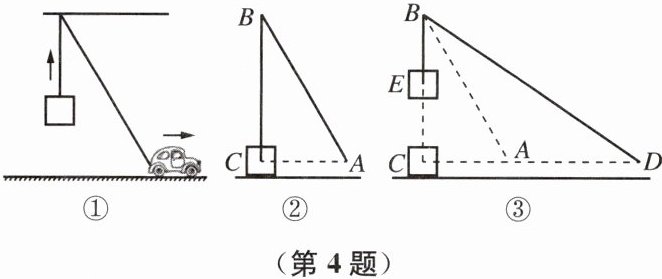 4. 如图①,在水平地面上,一辆小车通过一根绕过定滑轮的绳子将物体竖直向上提起. 起始位置如图②,此时测得点 $ A $ 到 $ BC $ 所在直线的距离 $ AC = 3 \mathrm{ m} $,$ \angle CAB = 60° $;停止位置如图③,此时测得 $ \angle CDB = 30° $,点 $ C $、$ A $、$ D $ 在同一条直线上.