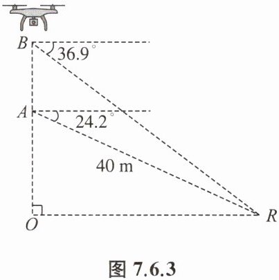例 1 如图 7.6.3,点 $ O $、$ R $ 在同一水平线上,无人机从点 $ O $ 竖直上升到点 $ A $ 时,测得点 $ A $ 到点 $ R $ 的距离为 $ 40 \mathrm{~m} $,点 $ R $ 的俯角为 $ 24.2^{\circ} $;无人机继续竖直上升到点 $ B $,测得点 $ R $ 的俯角为 $ 36.9^{\circ} $.求无人机从点 $ A $ 到点 $ B $ 的上升高度 $ AB $.(精确到 $ 0.1 \mathrm{~m} $;参考数据:$ \sin 24.2^{\circ} \approx 0.41 $,$ \cos 24.2^{\circ} \approx 0.91 $,$ \tan 24.2^{\circ} \approx 0.45 $,$ \sin 36.9^{\circ} \approx 0.60 $,$ \cos 36.9^{\circ} \approx 0.80 $,$ \tan 36.9^{\circ} \approx 0.75 $)