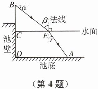 4. 科技社团用学校游泳池进行一次光的折射实验.如图,光自点 $ B $ 处发出,经水面折射到池底 $ A $ 处.已知 $ BE $ 与水平线的夹角 $ \alpha = 37^{\circ} $,点 $ B $ 到水面的距离 $ BC = 1.2 \mathrm{~m} $,点 $ A $ 处水深为 $ 1.2 \mathrm{~m} $,到池壁的距离 $ AD = 2.5 \mathrm{~m} $,点 $ B $、$ C $、$ D $ 在同一条直线上.记入射角为 $ \beta $,折射角为 $ \gamma $,求 $ \frac{\sin \beta}{\sin \gamma} $ 的值.(参考数据:$ \sin 37^{\circ} \approx 0.6 $,$ \cos 37^{\circ} \approx 0.8 $,$ \tan 37^{\circ} \approx 0.75 $)