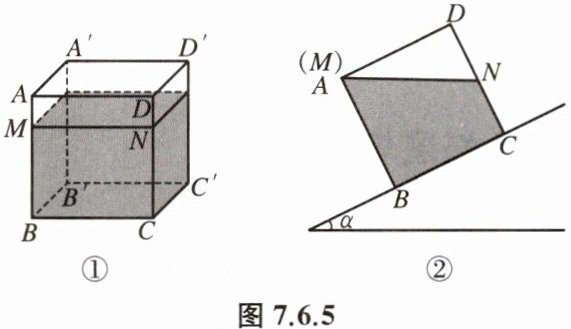 例 1 如图 7.6.5①,棱长为 9 cm 的密封透明正方体容器水平放置在桌面上,其中水面高度 $ BM = 7 \mathrm{cm} $.将此正方体放在坡角为 $ \alpha $的斜坡上,其主视图如图②所示,此时点 $ M $与点 $ A $重合,则 $ \tan \alpha = $