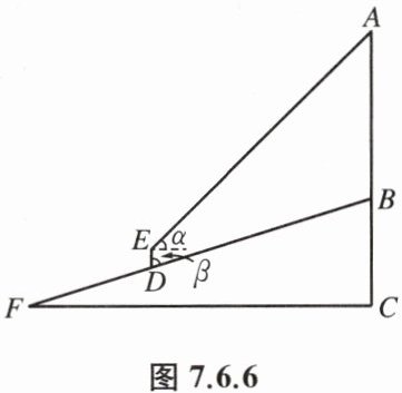 例 2 如图 7.6.6,小宇用测角仪测量公园山坡上一个信号杆的高度,他在坡面 $ FB $上的点 $ D $处安装测角仪 $ DE $,测得信号杆顶端 $ A $的仰角 $ \alpha $为 $ 45^{\circ} $,$ DE $与坡面的夹角 $ \beta $为 $ 72.5^{\circ} $,点 $ D $与信号杆底端 $ B $之间的距离 $ DB = 22 \mathrm{m} $.已知 $ DE = 1.7 \mathrm{m} $,点 $ A $、$ B $、$ C $在同一条直线上,$ AB $、$ DE $均与水平线 $ FC $垂直.求信号杆 $ AB $的高.(参考数据:$ \sin 72.5^{\circ} \approx 0.95 $,$ \cos 72.5^{\circ} \approx 0.30 $,$ \tan 72.5^{\circ} \approx 3.17 $)