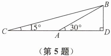 5. 某小区物业公司决定对小区环境进行优化改造.如图,$ AB $表示该小区一段长为 $ 20 \mathrm{m} $的斜坡,坡角 $ \angle BAD = 30^{\circ} $,$ BD ⊥ AD $,垂足为 $ D $.为方便通行,物业公司在不改变斜坡高度的情况下,把坡角降为 $ 15^{\circ} $.