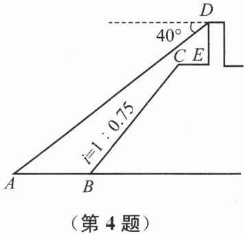 4. 如图,小王在江边某瞭望台 $ D $处测得江面上渔船 $ A $的俯角为 $ 40^{\circ} $,若 $ DE = 3 \mathrm{m} $,$ CE = 2 \mathrm{m} $,$ CE $平行于江面 $ AB $,迎水坡 $ BC $的坡度 $ i = 1:0.75 $,坡长 $ BC = 10 \mathrm{m} $,则此时 $ AB $的长约为