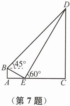 7. 某兴趣小组开展了测量电线塔高度的实践活动.如图,斜坡 $ BE $的坡度 $ i = 1:\sqrt{3} $,$ BE = 6 \mathrm{m} $,在 $ B $处测得电线塔 $ CD $顶部 $ D $的仰角为 $ 45^{\circ} $,在 $ E $处测得电线塔 $ CD $顶部 $ D $的仰角为 $ 60^{\circ} $.求电线塔 $ CD $的高度.