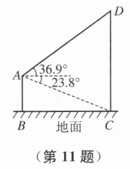 11. 如图,在建筑物$AB$和$CD$的楼顶之间悬挂彩带,彩带用线段$AD$表示.在点$A$测得点$C$的俯角为$23.8^{\circ}$,点$D$的仰角为$36.9^{\circ}$.已知$AB = 13.20\ \mathrm{m}$,求$AD$的长.(精确到$0.1\ \mathrm{m}$,参考数据:$\sin 23.8^{\circ} \approx 0.40$,$\cos 23.8^{\circ} \approx 0.91$,$\tan 23.8^{\circ} \approx 0.44$,$\sin 36.9^{\circ} \approx 0.60$,$\cos 36.9^{\circ} \approx 0.80$,$\tan 36.9^{\circ} \approx 0.75$)