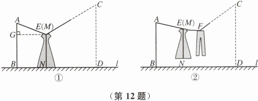12. 如图①,院子里有一个晾衣装置,立柱$AB$和$CD$分别垂直于地面$l$,垂足分别为$B$、$D$,$AB = 19\ \mathrm{dm}$,$CD > AB$.在点$A$、$C$之间的晾衣绳上有固定挂钩$E$,$AE = 13\ \mathrm{dm}$,小丽把一件连衣裙$MN$挂在点$E$处(点$M$与点$E$重合),发现$MN ⊥ l$.且当这件连衣裙下端点$N$刚好接触到地面$l$时,点$E$到直线$AB$的距离$EG = 12\ \mathrm{dm}$.
