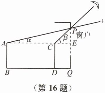 16. 某晚,小宇在家通过窗户的最高点$P$恰好看到一颗星星,此时小宇距窗户的水平距离$BQ = 4\ \mathrm{m}$,仰角为$\alpha$;小宇向前走了$3\ \mathrm{m}$后到达点$D$,通过点$P$恰好看到月亮,仰角为$\beta$,如图.已知,小宇的眼睛与水平地面$BQ$的距离$AB = CD = 1.6\ \mathrm{m}$,点$P$到$BQ$的距离$PQ = 2.6\ \mathrm{m}$,$AC$的延长线交$PQ$于点$E$.