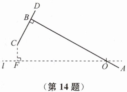 14. 如图为《天工开物》记载的用于春捣谷物的工具——“碓”的示意图.已知$AB ⊥ CD$,垂足为$B$,$AB$与水平线$l$相交于点$O$,$OE ⊥ l$.若$BC = 4\ \mathrm{dm}$,$OB = 12\ \mathrm{dm}$,$\angle BOE = 60^{\circ}$,则点$C$到水平线$l$的距离$CF$为