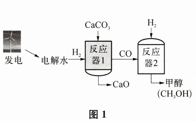 12. 电解水制氢联合碳酸钙分解制备氧化钙,能减少碳排放,助力碳中和。该新方法的示意图如图 1 所示。反应器 1 中$CO$、$CO_2$的含量随反应温度的变化如图 2 所示。下列说法错误的是(