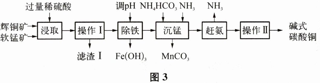 辉铜矿的主要成分为$Cu_2S$,软锰矿的主要成分为$MnO_2$,两者均含有少量二氧化硅、氧化铁等杂质。工业上综合利用这两种矿物制备碱式碳酸铜的主要工艺流程如图 3 所示。