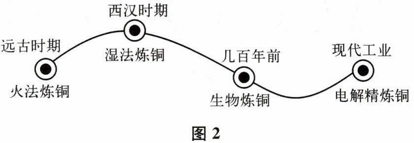 (3)炼铜工艺经历了如图 2 所示几个过程。其中生物炼铜是先将硫化铜($CuS$)在硫杆菌的作用下与空气中的氧气化合生成硫酸铜,该反应的化学方程式为