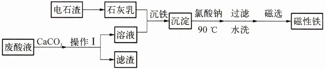 16. (10 分)某废酸液中主要含有$H_2SO_4$和$FeSO_4$,研究人员用$CaCO_3$消耗部分酸,再加入廉价的电石渣(主要成分为$CaO$),经一系列操作可得到磁性铁($Fe_3O_4$),具体流程如下页图所示。