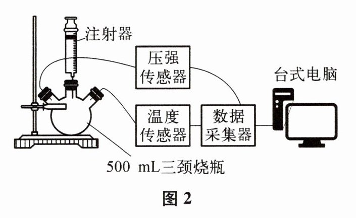 小组设计了如图2所示装置,检查气密性后,将5g铁粉和2g碳粉加入三颈烧瓶,t₁s加入2mL饱和NaCl溶液后,将一只装有5mL稀盐酸的注射器插到烧瓶上(此时没有推动注射器活塞),采集数据。