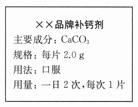 2. 右图所示为某品牌补钙剂说明书的一部分。取 1 片钙片,放入盛有 21.64 g 稀盐酸的烧杯中,其中的碳酸钙与稀盐酸恰好完全反应(其他成分不溶于水,也不与稀盐酸反应),最后烧杯内物质的质量为 23.2 g。