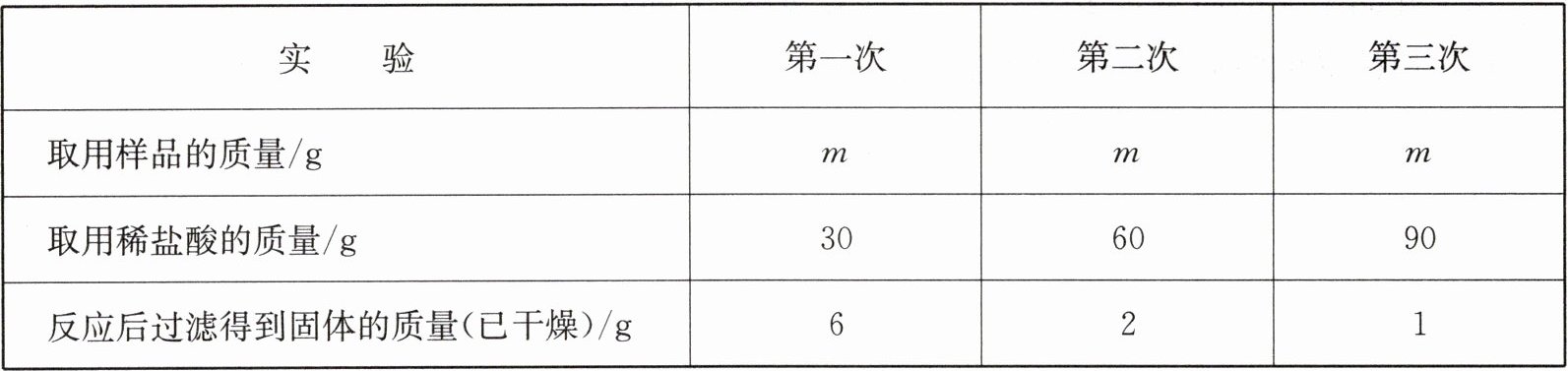 (3) 解:由表中数据可知,第一次加入30g稀盐酸,固体减少的质量为$m - 6$;第二次加入60g稀盐酸(相对于第一次增加30g),固体减少的质量为$6 - 2 = 4$g;第三次加入90g稀盐酸(相对于第二次增加30g),固体减少的质量为$2 - 1 = 1$g。说明前两次加入的稀盐酸完全反应,第三次稀盐酸过量。