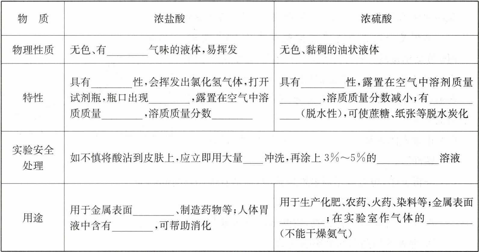答案:2.刺激性 挥发 白雾 减小 减小 吸水 增加 强烈的腐蚀性 水 碳酸氢钠 除锈 盐酸 除锈 干燥剂