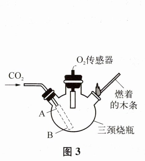 (写两条)。(4) 收集 CO₂时,常用燃着的木条放在集气瓶瓶口验满。木条熄灭,CO₂真的集满了吗?如图 3 所示,向三颈烧瓶中持续通 CO₂,测定瓶内 O₂体积分数的变化情况,并用燃着的木条置于瓶口观察其是否熄灭,结果如图 4 所示。