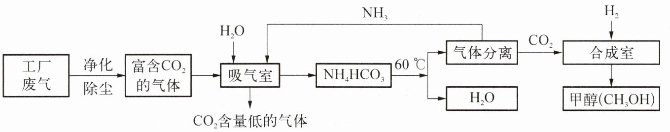 。答案:6.(1)二氧化碳 (2)① 温室效应 ②$NH_{3}+H_{2}O+CO_{2}=\!=\!=NH_{4}HCO_{3}$ 化合 ③碳酸氢铵受热易分解 ④$CO_{2}+3H_{2}\stackrel{一定温度、压强}{\stackrel{催化剂}{=\!=\!=}}CH_{3}OH + H_{2}O$ ⑤制取氢气(或氨气)的成本较高