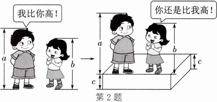 2. (2024·长春)不等关系在生活中广泛存在. 如图,$ a $,$ b $ 分别表示两位同学的身高,$ c $ 表示台阶的高度. 图中两人的对话体现的数学原理是(