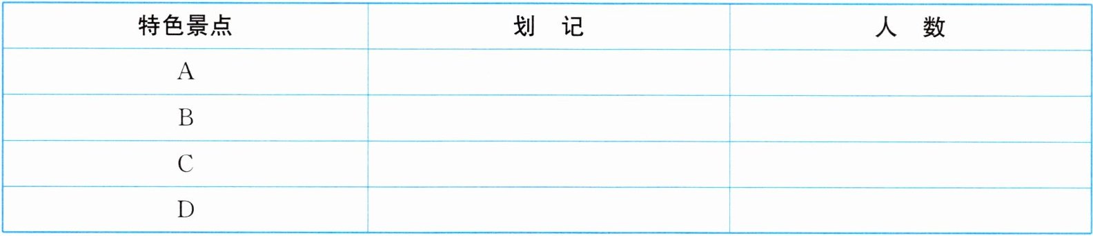7. 为了了解本班全体同学喜欢去某市特色景点游玩的情况,小明对班级 32 名同学进行调查,得到最喜欢的 A,B,C,D 四个特色景点的调查结果如下: