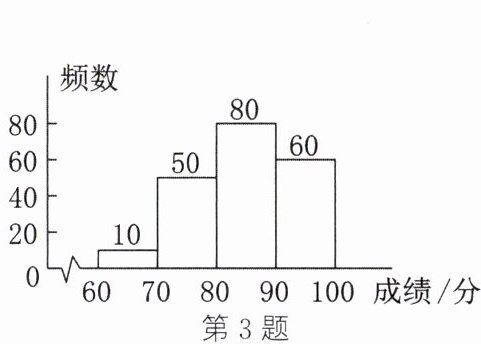 3. 某校学生“亚运知识”竞赛成绩的频数分布直方图(每一组含前一个边界值,不含后一个边界值)如图所示,其中成绩在80分及以上的学生人数为