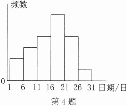 4. 某市教育局在各中学进行了论文的评比,论文的交稿时间为5月1日至30日,评委会把各中学交的论文的篇数按5天一组分组统计,绘制成如图所示的频数分布直方图(每组含前一个边界值,不含后一个边界值)。从左往右各小长方形的高的比为2:3:4:6:4:1,第二组的频数为18。