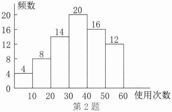 2. 小文对他所在小区居民当月使用“共享单车”的次数进行了抽样调查,并绘制成了如图所示的频数分布直方图(每一组含前一个边界值,不含后一个边界值)。下列说法正确的是(