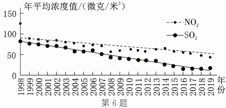 6. (原创)多年来,某市治理大气污染,空气质量持续改善,主要污染物的年平均浓度值全面下降。如图所示为1998年至2019年二氧化硫(SO₂)和二氧化氮(NO₂)的年平均浓度值变化趋势图,下列说法错误的是(
