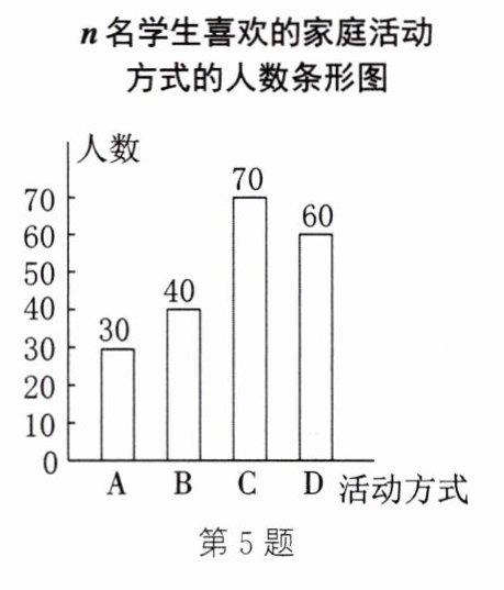 5. 某校团委随机抽取了n名本校学生,对“世界家庭日”当天所喜欢的家庭活动方式进行问卷调查,问卷中的家庭活动方式包括:A. 在家里聚餐;B. 去影院看电影;C. 到公园游玩;D. 进行其他活动. 每名学生都按要求只选择了其中一种,该校团委收回全部调查问卷后,将收集到的数据进行整理并绘制成如图所示的统计图. 根据统计图提供的信息,解答下列问题: