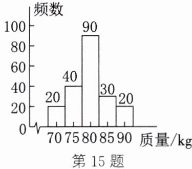 15. 某养猪场对200头生猪的质量进行统计,得到频数分布直方图(每一组含前一个边界值,不含后一个边界值)如图所示,其中质量在77.5 kg及以上的生猪有