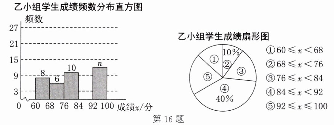 16. (2025·海安期末)某校为了解七年级学生的气象知识竞赛成绩x(百分制,单位:分),随机抽取了若干名学生的成绩,该校甲、乙两个数学课外活动小组对数据进行了整理、描述,部分信息如下:
