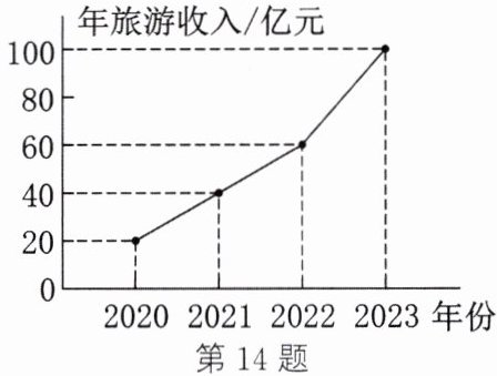 14. 某人为了了解他所在地区的旅游情况,收集了该地区2020~2023年每年旅游收入的有关数据,整理并绘制成折线图(如图). 根据图中的信息,可知该地区2020~2023年四年的年平均旅游收入是
