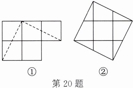 20. 如图①,将由$5$个边长为$1$的小正方形拼成的图形沿虚线剪开,将剪开后的图形拼成如图②所示的大正方形,则图②中大正方形的边长是多少?请将这个数在数轴上表示出来。