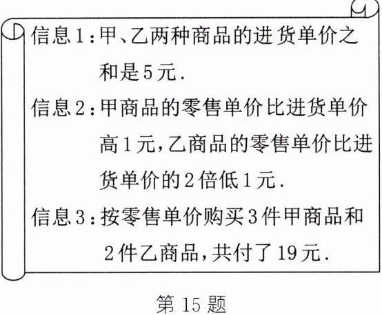答案:15. 设甲商品的进货单价是$x$元,乙商品的进货单价是$y$元. 由题意,得$\begin{cases}x + y = 5,\\3(x + 1) + 2(2y - 1) = 19,\end{cases}$ 解得$\begin{cases}x = 2,\\y = 3.\end{cases}$ $\therefore 4 × (2 + 1) + 5 × (2 × 3 - 1) = 37$(元). 答:按零售单价购买$4$件甲商品和$5$件乙商品应付$37$元