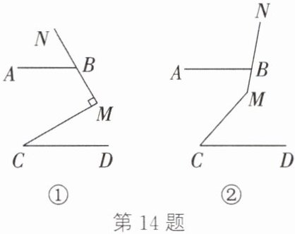 14. (1) 如图①,过点M作MK//AB,则∠ABM + ∠KMB = 180°.