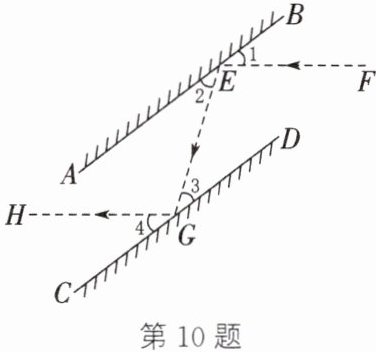 10. 如图,潜望镜中的两面镜子$AB$,$CD$互相平行. 光线经过镜子反射时,$∠1 = ∠2$,$∠3 = ∠4$. 请说明为什么进入潜望镜的光线$FE$与离开潜望镜的光线$GH$是互相平行的.