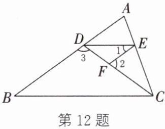 12. 如图,在三角形$ABC$中,点$D$,$E$分别在$AB$,$AC$上,$EF$交$DC$于点$F$,$∠3 + ∠2 = 180^{\circ}$,$∠1 = ∠B$.