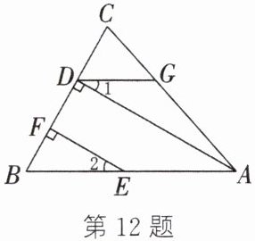 12. (1)如图,$\angle CDG=\angle B$,$AD⊥ BC$ 于点 $D$,点 $E$ 在 $AB$ 上,$EF⊥ BC$ 于点 $F$。试说明:$\angle 1=\angle 2$。