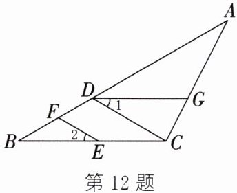 12. (2025·海安期中)如图,点$D$,$F$在线段$AB$上,点$E$,$G$分别在线段$BC$和$AC$上,$CD// EF$,$\angle 1 = \angle 2$。