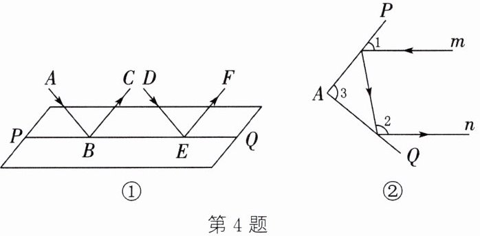4. 科学实验表明,平面镜反射光线的规律是射到平面镜上的光线和反射出来的光线与平面镜所夹的角相等. 如图①,一束平行光线 $ AB $ 与 $ DE $ 射向同一个平面镜后被反射,此时有 $ \angle ABP = \angle CBE $,$ \angle DEB = \angle FEQ $. 如图②,一束光线 $ m $ 射到平面镜 $ AP $ 上,被平面镜 $ AP $ 反射到平面镜 $ AQ $ 上,又被平面镜 $ AQ $ 反射,且平面镜 $ AQ $ 反射出来的光线 $ n $ 平行于光线 $ m $.