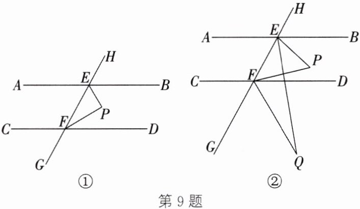9. 已知直线 $ AB // CD $,直线 $ GH $ 分别交 $ AB $,$ CD $ 于点 $ E $,$ F $.