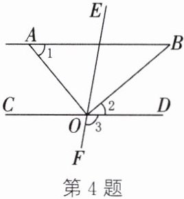 4. 如图,直线 $ CD $,$ EF $ 交于点 $ O $,$ OA $,$ OB $ 分别平分 $ \angle COE $ 和 $ \angle DOE $,且 $ \angle 1 + \angle 2 = 90^{\circ} $。