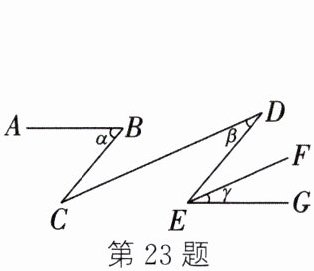 23. 如图,$AB// EG$,$CD// EF$,$BC// DE$。若 $\angle \alpha = 50^{\circ}$,$\angle \beta = 26^{\circ}$,则 $\angle \gamma$ 的度数为