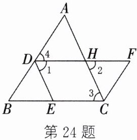 24. 如图,点 $D$,$E$,$H$ 分别在三角形 $ABC$ 的边 $AB$,$BC$,$AC$ 上,连接 $DE$,过点 $C$ 作 $CF$ 交 $DH$ 的延长线于点 $F$,且满足 $\angle B + \angle BCF = 180^{\circ}$。若 $DE// AC$,$\angle 1 = \angle 3$,求证:$\angle B = \angle F$。