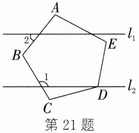 21. 如图,$l_1// l_2$,已知 $\angle 1 - \angle 2 = 70^{\circ}$,则 $\angle ABC$ 的度数是