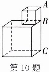 10. 如图,将两个正方体摞在一起(点$A$,$B$,$C$在同一条直线上),大正方体的体积为$1331\mathrm{cm}^{3}$,小正方体的体积为$125\mathrm{cm}^{3}$,则最高点$A$与最低点$C$之间的距离是