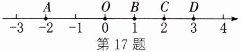 17. 如图,数轴上的点$A$,$O$,$B$,$C$,$D$表示的数分别为$-2$,$0$,$1$,$2$,$3$,则表示$3-\sqrt{5}$的点落在线段(