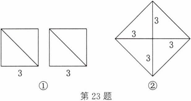 23. 将两块边长均为$3$的小正方形纸板按如图①所示的方式剪开,拼成如图②所示的一块大正方形纸板,你能求出这块大正方形纸板的面积吗?它的边长是整数吗?如果不是整数,那么请你估计它的边长的值在哪两个相邻的整数之间.